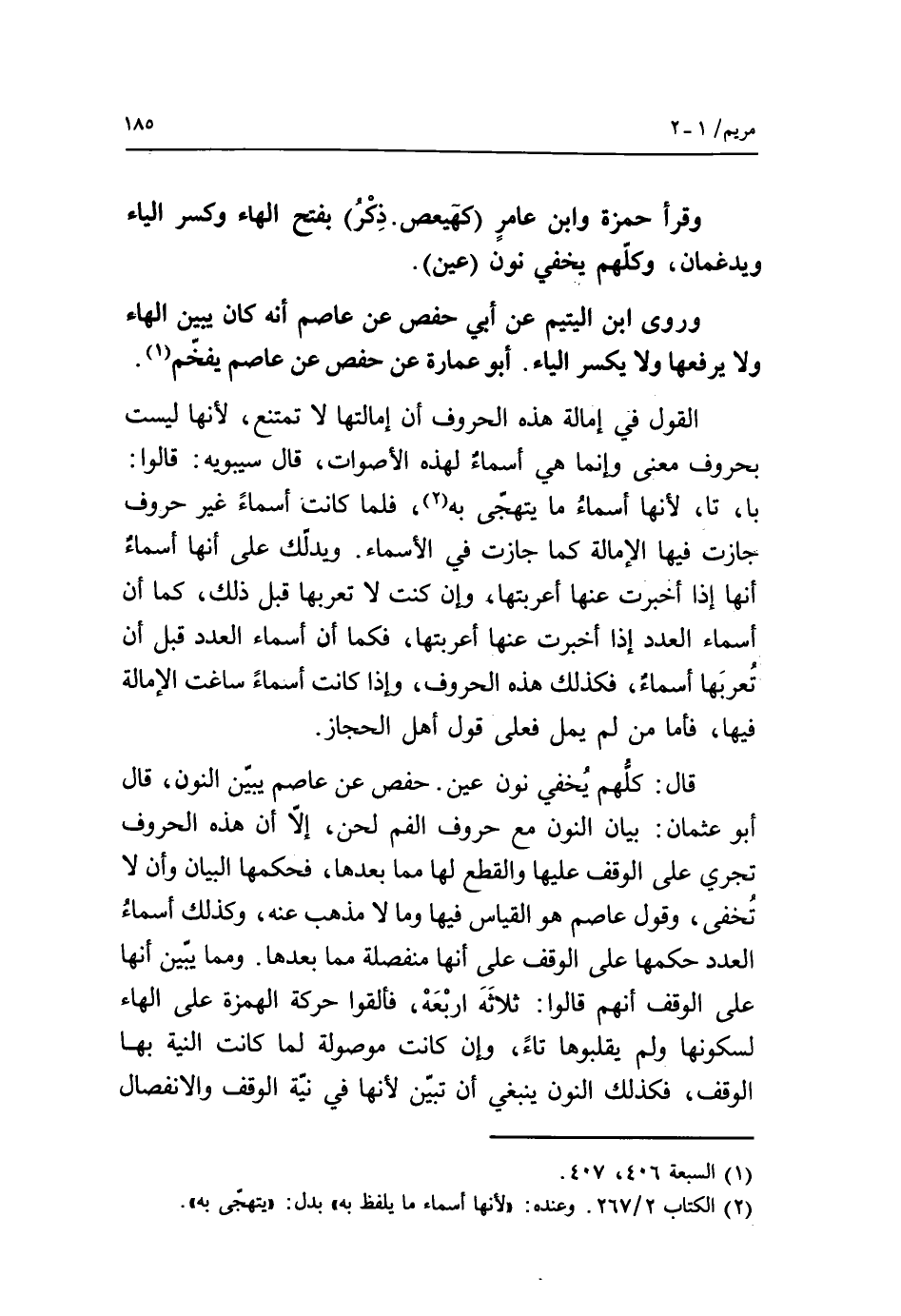 قال: كلّهم يخفي نون عين. حفص عن عاصم يبيّن النون، قال أبو عثمان: بيان النون مع حروف الفم لحن، إلا أن هذه الحروف تجري على الوقف عليها والقطع لها مما بعدها، فحكمها البيان وأن لا تخفى، وقول عاصم هو القياس فيها وما لا مذهب عنه، وكذلك أسماء العدد حكمها على الوقف على أنها منفصلة مما بعدها. ومما يبيّن أنها على الوقف أنهم قالوا: ثلاثة اربعة، فألقوا حركة الهمزة على الهاء لسكونها ولم يقلبوها تاء، وإن كانت موصولة لما كانت النية بها الوقف، فكذلك النون ينبغي أن تبيّن لأنها في نيّة الوقف والانفصال