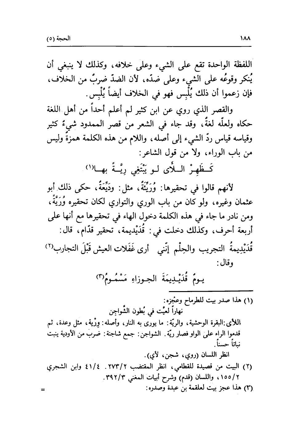 كظهر اللأى لو يبتغي ريّة بها «1» لأنهم قالوا في تحقيرها: وريئة، مثل: وديعة، حكى ذلك أبو عثمان وغيره، ولو كان من باب الوري والتواري لكان تحقيره وريّة، ومن نادر ما جاء في هذه الكلمة دخول الهاء في تحقيرها مع أنها على أربعة أحرف، وكذلك دخلت في: قديديمة، وتحقير قدّام، قال: