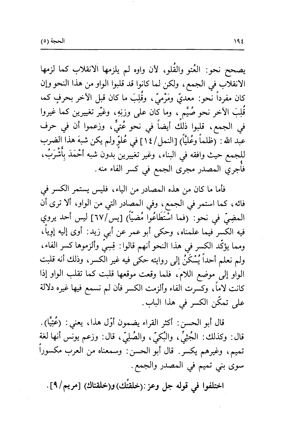 يصحح نحو: العتو والقلو، لأن واوه لم يلزمها الانقلاب كما لزمها الانقلاب في الجمع، ولكن لما كانوا قد قلبوا الواو من هذا النحو وإن كان مفردا نحو: معديّ ومرميّ، وقلب ما كان قبل الآخر بحرف كما قلب الآخر نحو صيّم، وما كان على وزنه، وغيّر تغييرين كما غيروا في الجمع، قلبوا ذلك أيضا في نحو عتيّ، وزعموا أن في حرف عبد الله: (ظلما وعليا) [النمل/ 14] في علوّ ولم يكن شبه هذا الضرب للجمع حيث وافقه في البناء، وغير تغييرين بدون شبه أحمد بأشرب، فأجري المصدر مجرى الجمع في كسر الفاء منه.