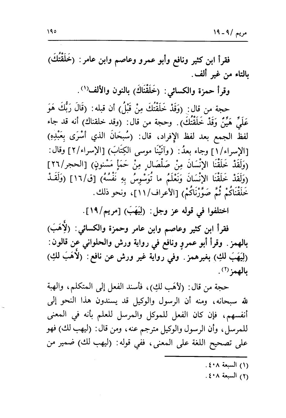 حجة من قال: وقد خلقتك من قبل أن قبله: قال ربك هو علي هين وقد خلقتك. وحجة من قال: (وقد خلقناك) أنه قد جاء لفظ الجمع بعد لفظ الإفراد، قال: سبحان الذي أسرى بعبده [الإسراء/ 1] وجاء بعد: وآتينا موسى الكتاب [الإسراء/ 2] وقال: