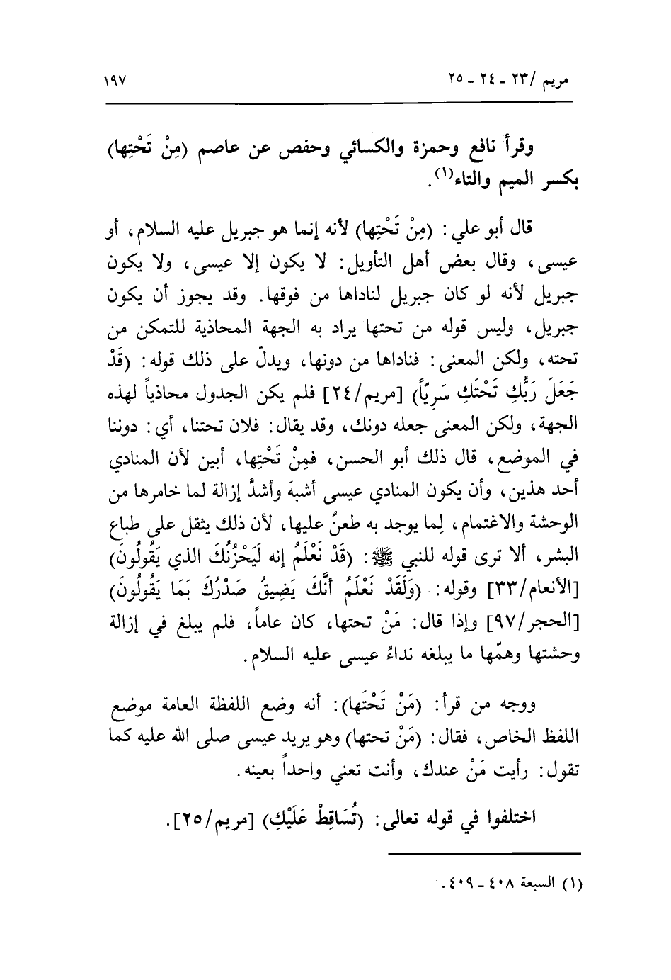 قال أبو علي: من تحتها لأنه إنما هو جبريل عليه السلام، أو عيسى، وقال بعض أهل التأويل: لا يكون إلا عيسى، ولا يكون جبريل لأنه لو كان جبريل لناداها من فوقها. وقد يجوز أن يكون جبريل، وليس قوله من تحتها يراد به الجهة المحاذية للتمكن من تحته، ولكن المعنى: فناداها من دونها، ويدلّ على ذلك قوله: قد جعل ربك تحتك سريا [مريم/ 24] فلم يكن الجدول محاذيا لهذه الجهة، ولكن المعنى جعله دونك، وقد يقال: فلان تحتنا، أي: دوننا في الموضع، قال ذلك أبو الحسن، فمن تحتها، أبين لأن المنادي أحد هذين، وأن يكون المنادي عيسى أشبه وأشدّ إزالة لما خامرها من الوحشة والاغتمام، لما يوجد به طعن عليها، لأن ذلك يثقل على طباع البشر، ألا ترى قوله للنبي صلّى الله عليه وسلّم: قد نعلم إنه ليحزنك الذي يقولون [الأنعام/ 33] وقوله: ولقد نعلم أنك يضيق صدرك بما يقولون [الحجر/ 97] وإذا قال: من تحتها، كان عاما، فلم يبلغ في إزالة وحشتها وهمّها ما يبلغه نداء عيسى عليه السلام.