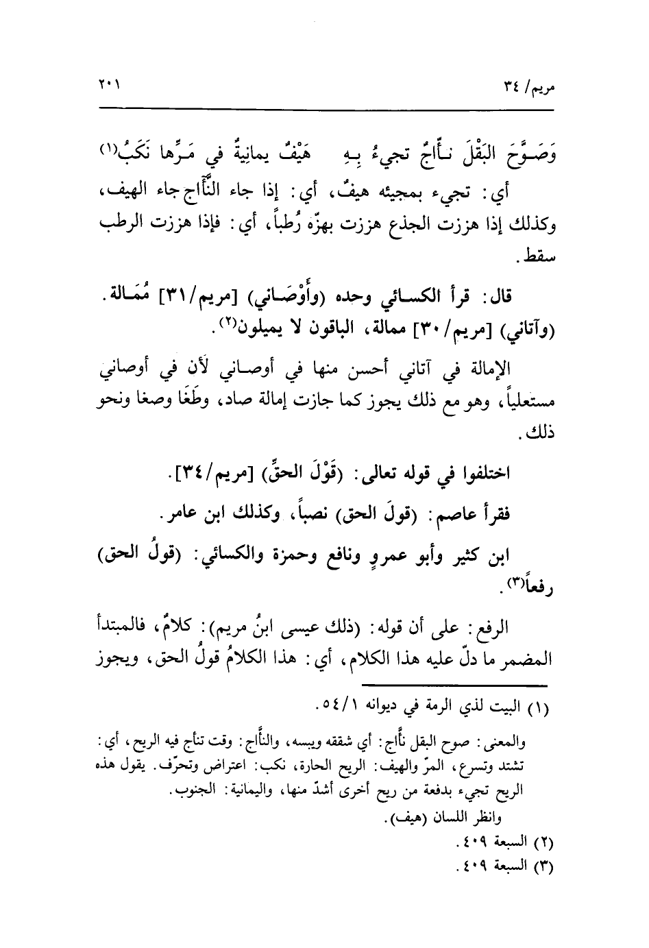 ابن كثير وأبو عمرو ونافع وحمزة والكسائي: (قول الحق) رفعا «3».