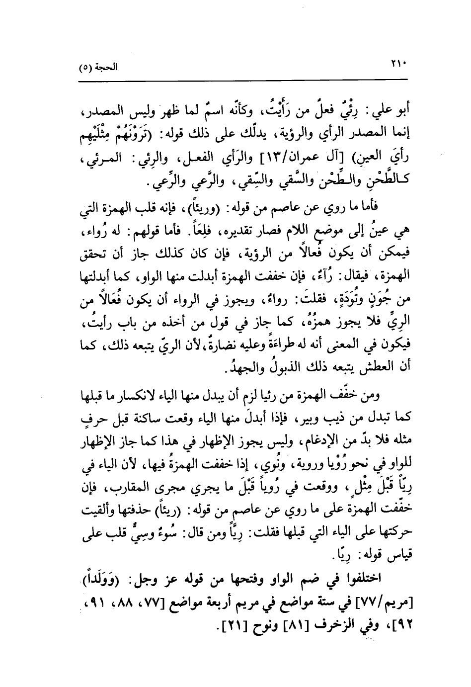 فأما ما روي عن عاصم من قوله: (وريئا)، فإنه قلب الهمزة التي هي عين إلى موضع اللام فصار تقديره، فلعا. فأما قولهم: له رواء، فيمكن أن يكون فعالا من الرؤية، فإن كان كذلك جاز أن تحقق الهمزة، فيقال: رآء، فإن خففت الهمزة أبدلت منها الواو، كما أبدلتها من جون وتودة، فقلت: رواء، ويجوز في الرواء أن يكون فعالا من الريّ فلا يجوز همزة، كما جاز في قول من أخذه من باب رأيت، فيكون في المعنى أنه له طراءة وعليه نضارة، لأن الريّ يتبعه ذلك، كما أن العطش يتبعه ذلك الذبول والجهد.