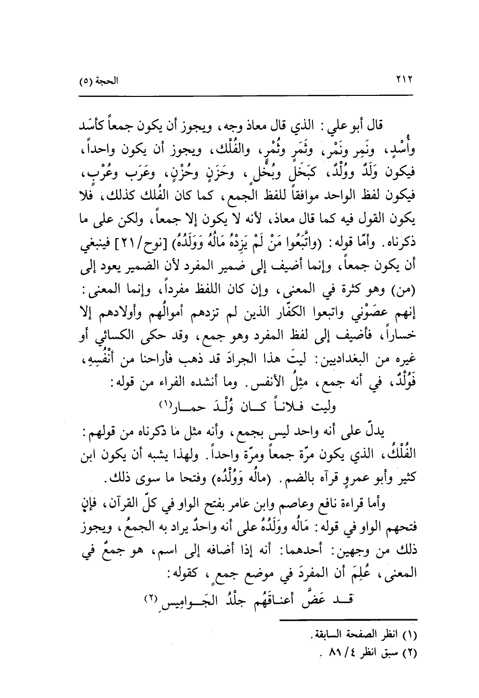 قال أبو علي: الذي قال معاذ وجه، ويجوز أن يكون جمعا كأسد وأسد، ونمر ونمر، وثمر وثمر، والفلك، ويجوز أن يكون واحدا، فيكون ولد وولد، كبخل وبخل، وحزن وحزن، وعرب وعرب، فيكون لفظ الواحد موافقا للفظ الجمع، كما كان الفلك كذلك، فلا يكون القول فيه كما قال معاذ، لأنه لا يكون إلا جمعا، ولكن على ما ذكرناه. وأما قوله: واتبعوا من لم يزده ماله وولده [نوح/ 21] فينبغي أن يكون جمعا، وإنما أضيف إلى ضمير المفرد لأن الضمير يعود إلى (من) وهو كثرة في المعنى، وإن كان اللفظ مفردا، وإنما المعنى:
