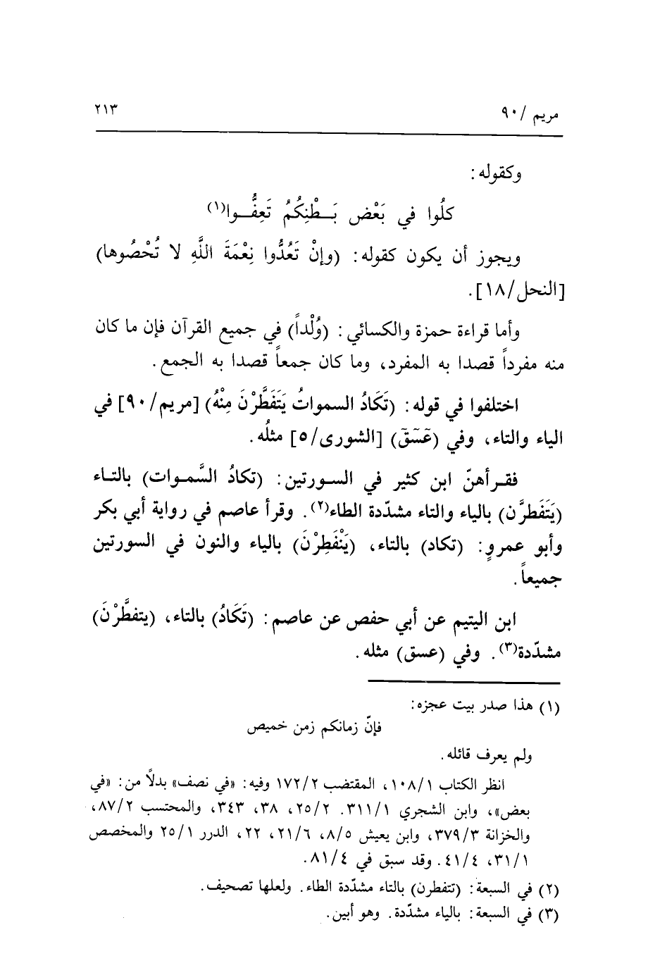 (2) في السبعة: (تتفطرن) بالتاء مشدّدة الطاء. ولعلها تصحيف.