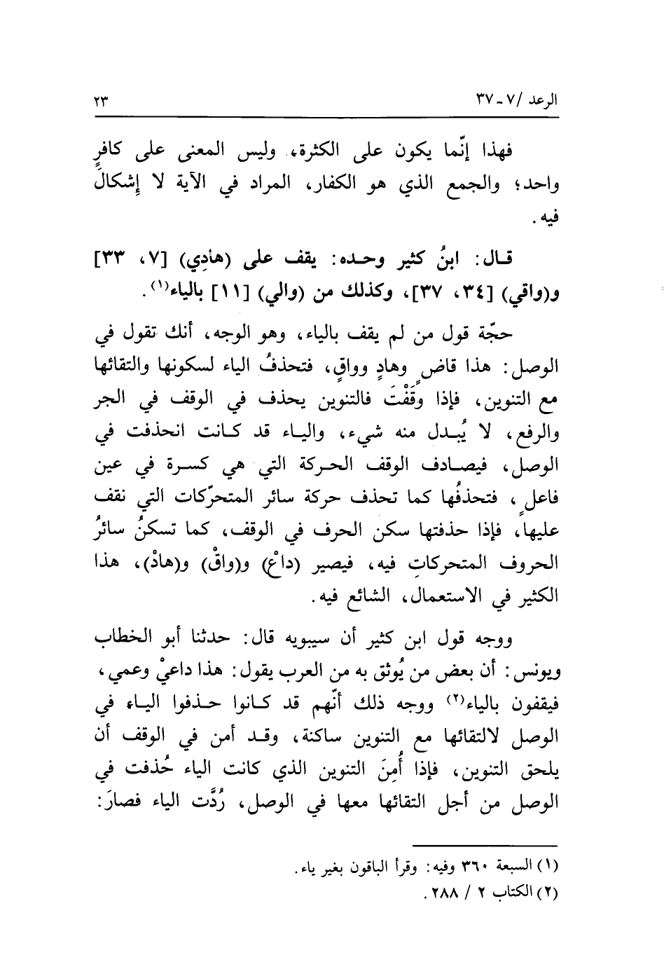 ووجه قول ابن كثير أن سيبويه قال: حدثنا أبو الخطاب ويونس: أن بعض من يوثق به من العرب يقول: هذا داعي وعمي، فيقفون بالياء «2» ووجه ذلك أنّهم قد كانوا حذفوا الياء في الوصل لالتقائها مع التنوين ساكنة، وقد أمن في الوقف أن يلحق التنوين، فإذا أمن التنوين الذي كانت الياء حذفت في الوصل من أجل التقائها معها في الوصل، ردّت الياء فصار: