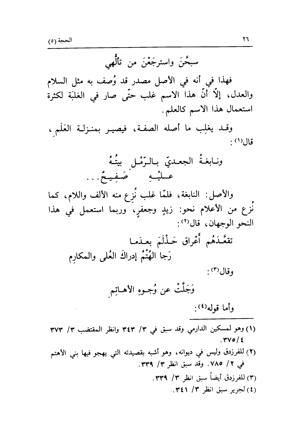 سبّحن واسترجعن من تألّهي فهذا في أنه في الأصل مصدر قد وصف به مثل السلام والعدل، إلّا أنّ هذا الاسم غلب حتّى صار في الغلبة لكثرة استعمال هذا الاسم كالعلم.