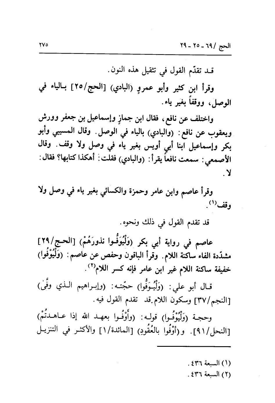 قال أبو علي: (وليوفّوا) حجّته: وإبراهيم الذي وفي [النّجم/ 37] وسكون اللام قد تقدم القول فيه.