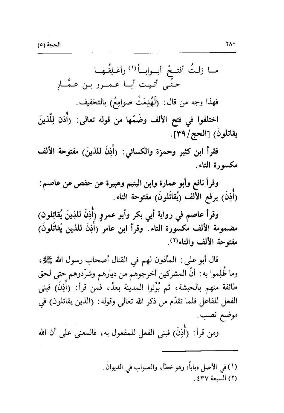 وقرأ عاصم في رواية أبي بكر وأبو عمرو أذن للذين يقاتلون مضمومة الألف مكسورة التاء. وقرأ ابن عامر (أذن للذين يقاتلون) مفتوحة الألف والتاء «2».
