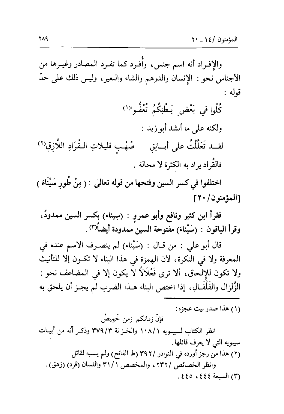 فقرأ ابن كثير ونافع وأبو عمرو: (سيناء) بكسر السين ممدود، وقرأ الباقون: سيناء مفتوحة السين ممدودة أيضا «3».
