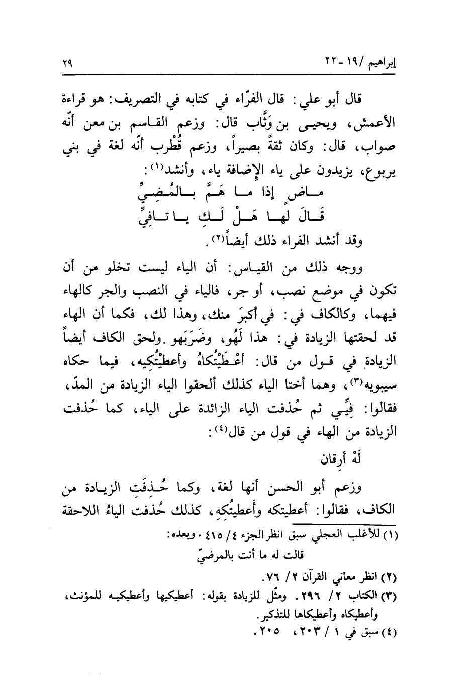 (3) الكتاب 2/ 296. ومثّل للزيادة بقوله: أعطيكيها وأعطيكيه للمؤنث، وأعطيكاه وأعطيكاها للتذكير.