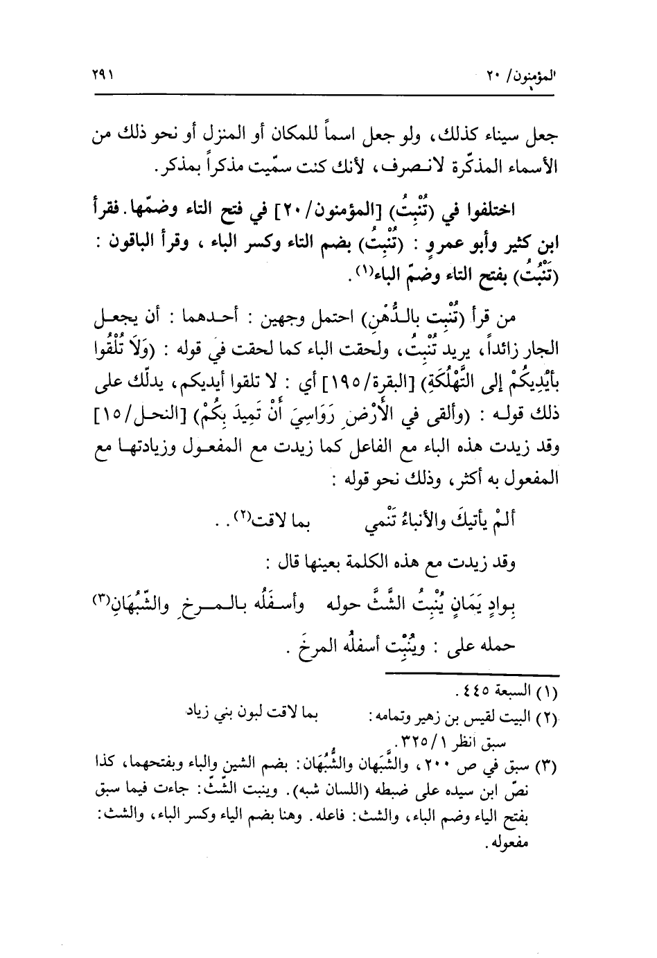 من قرأ (تنبت بالدّهن) احتمل وجهين: أحدهما: أن يجعل الجار زائدا، يريد تنبت، ولحقت الباء كما لحقت في قوله: ولا تلقوا بأيديكم إلى التهلكة [البقرة/ 195] أي: لا تلقوا أيديكم، يدلّك على ذلك قوله: وألقى في الأرض رواسي أن تميد بكم [النحل/ 15] وقد زيدت هذه الباء مع الفاعل كما زيدت مع المفعول وزيادتها مع المفعول به أكثر، وذلك نحو قوله: