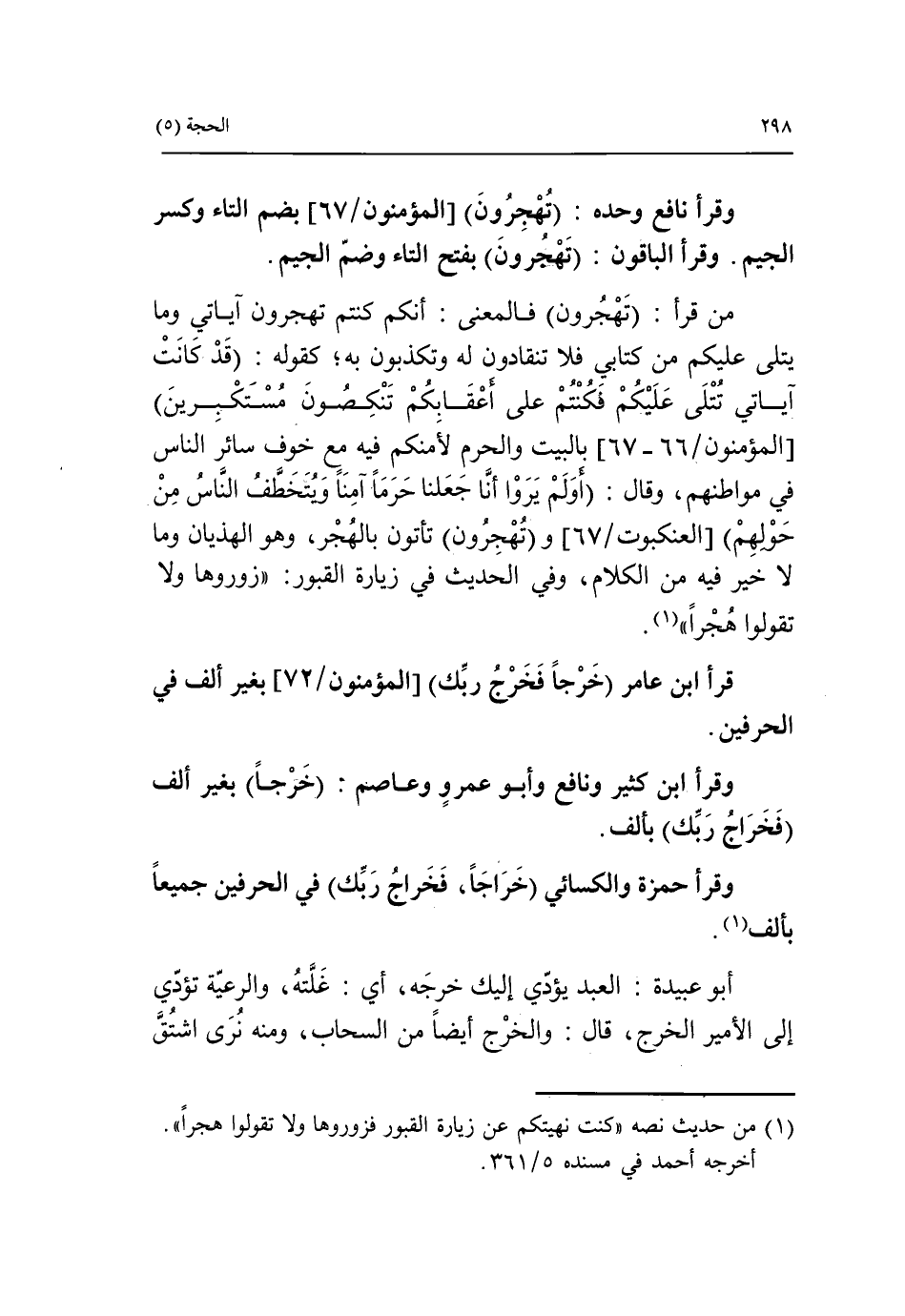 وقرأ نافع وحده: (تهجرون) [المؤمنون/ 67] بضم التاء وكسر الجيم. وقرأ الباقون: تهجرون بفتح التاء وضمّ الجيم.