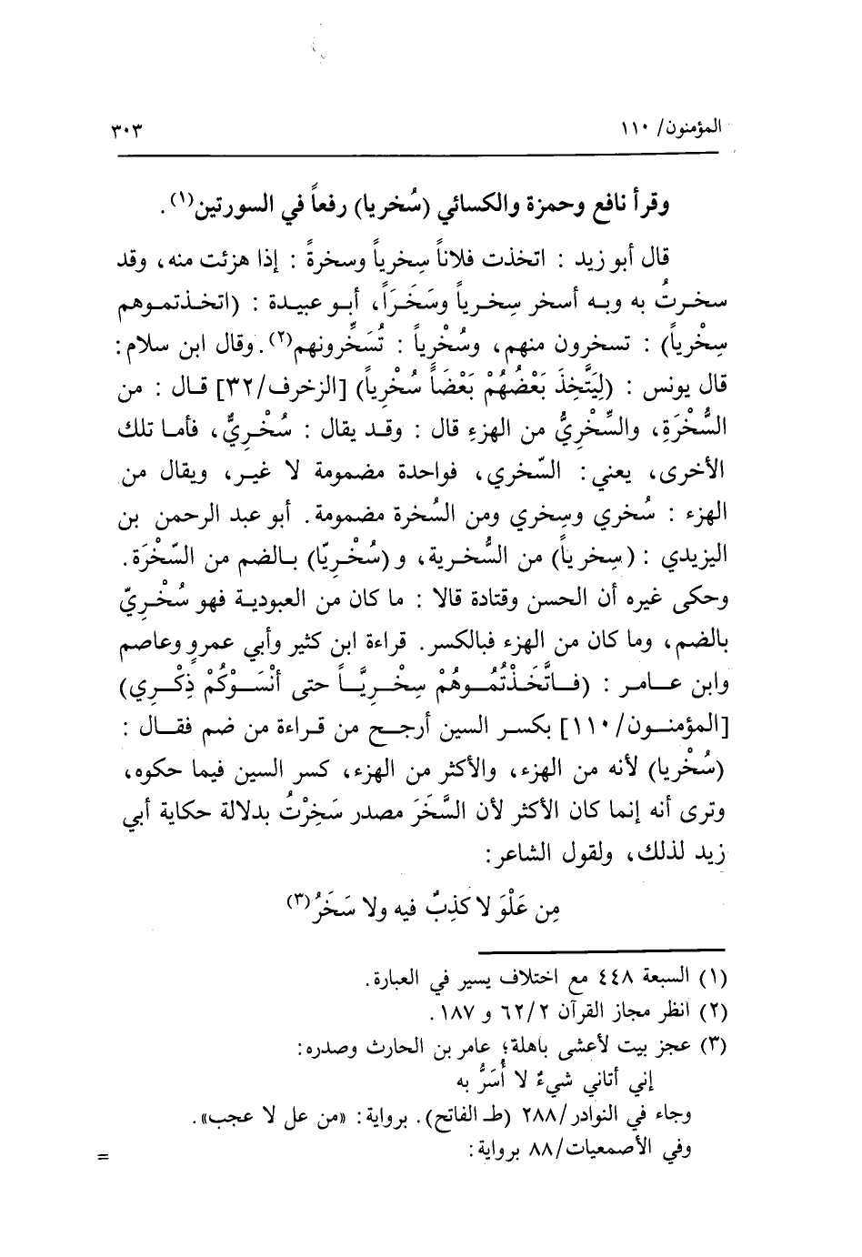(سخريا) لأنه من الهزء، والأكثر من الهزء، كسر السين فيما حكوه، وترى أنه إنما كان الأكثر لأن السّخر مصدر سخرت بدلالة حكاية أبي زيد لذلك، ولقول الشاعر: