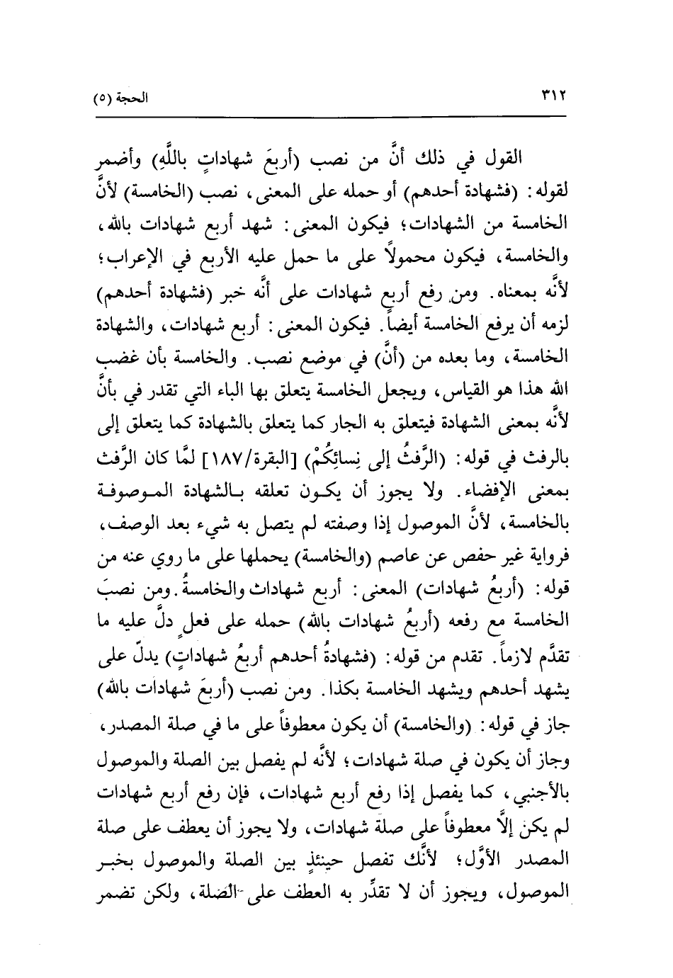 القول في ذلك أنّ من نصب (أربع شهادات بالله) وأضمر لقوله: فشهادة أحدهم أو حمله على المعنى، نصب (الخامسة) لأنّ الخامسة من الشهادات، فيكون المعنى: شهد أربع شهادات بالله، والخامسة، فيكون محمولا على ما حمل عليه الأربع في الإعراب، لأنّه بمعناه. ومن رفع أربع شهادات على أنّه خبر فشهادة أحدهم لزمه أن يرفع الخامسة أيضا. فيكون المعنى: أربع شهادات، والشهادة الخامسة، وما بعده من (أنّ) في موضع نصب. والخامسة بأن غضب الله هذا هو القياس، ويجعل الخامسة يتعلق بها الباء التي تقدر في بأنّ لأنّه بمعنى الشهادة فيتعلق به الجار كما يتعلق بالشهادة كما يتعلق إلى بالرفث في قوله: الرفث إلى نسائكم [البقرة/ 187] لمّا كان الرّفث بمعنى الإفضاء. ولا يجوز أن يكون تعلقه بالشهادة الموصوفة بالخامسة، لأنّ الموصول إذا وصفته لم يتصل به شيء بعد الوصف، فرواية غير حفص عن عاصم والخامسة يحملها على ما روي عنه من قوله: أربع شهادات المعنى: أربع شهادات والخامسة. ومن نصب الخامسة مع رفعه أربع شهادات بالله حمله على فعل دلّ عليه ما تقدم لازما. تقدم من قوله: فشهادة أحدهم أربع شهادات يدلّ على يشهد أحدهم ويشهد الخامسة بكذا. ومن نصب (أربع شهادات بالله) جاز في قوله: والخامسة أن يكون معطوفا على ما في صلة المصدر، وجاز أن يكون في صلة شهادات، لأنّه لم يفصل بين الصلة والموصول بالأجنبي، كما يفصل إذا رفع أربع شهادات، فإن رفع أربع شهادات لم يكن إلّا معطوفا على صلة شهادات، ولا يجوز أن يعطف على صلة المصدر الأوّل، لأنّك تفصل حينئذ بين الصلة والموصول بخبر الموصول، ويجوز أن لا تقدّر به العطف على الصلة، ولكن تضمر