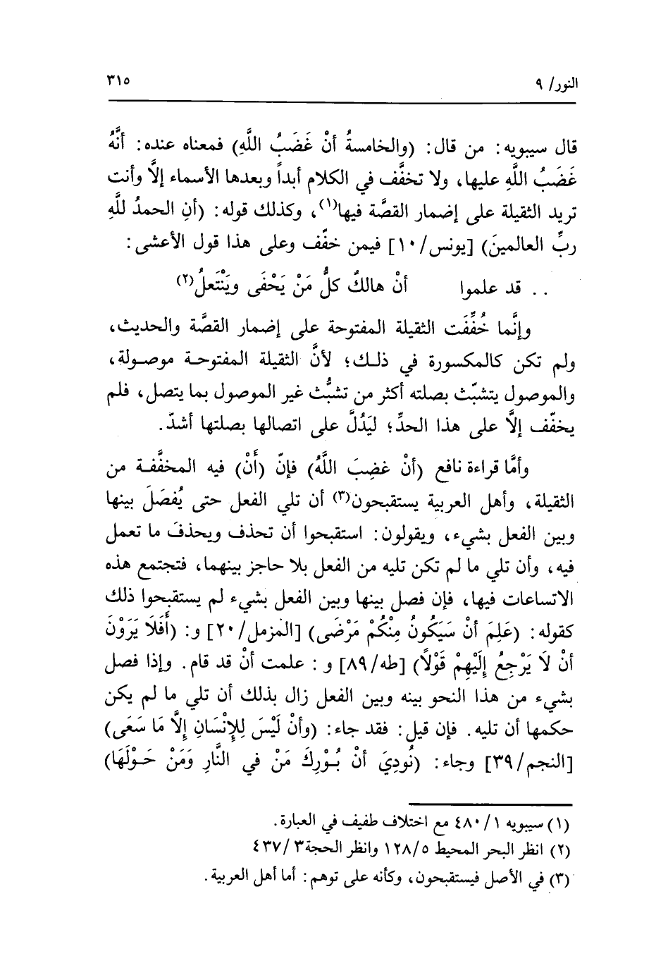 وأمّا قراءة نافع (أن غضب الله) فإنّ (أن) فيه المخفّفة من الثقيلة، وأهل العربية يستقبحون «3» أن تلي الفعل حتى يفصل بينها وبين الفعل بشيء، ويقولون: استقبحوا أن تحذف ويحذف ما تعمل فيه، وأن تلي ما لم تكن تليه من الفعل بلا حاجز بينهما، فتجتمع هذه الاتساعات فيها، فإن فصل بينها وبين الفعل بشيء لم يستقبحوا ذلك كقوله: علم أن سيكون منكم مرضى [المزمل/ 20] و: أفلا يرون أن لا يرجع إليهم قولا [طه/ 89] و: علمت أن قد قام. وإذا فصل بشيء من هذا النحو بينه وبين الفعل زال بذلك أن تلي ما لم يكن حكمها أن تليه. فإن قيل: فقد جاء: وأن ليس للإنسان إلا ما سعى [النجم/ 39] وجاء: نودي أن بورك من في النار ومن حولها