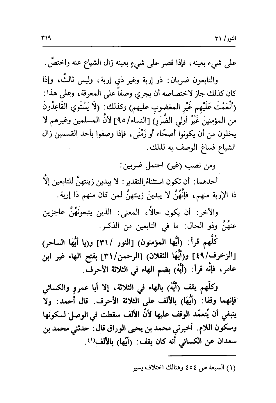 وكلّهم يقف (أيّة) بالهاء في الثلاثة، إلا أبا عمرو والكسائي فإنّهما وقفا: (أيّها) بالألف على الثلاثة الأحرف. قال أحمد: ولا ينبغي أن يتعمّد الوقف عليها لأنّ الألف سقطت في الوصل لسكونها وسكون اللام. أخبرني محمد بن يحيى الوراق قال: حدثني محمد بن سعدان عن الكسائي أنه كان يقف: (أيّها) بالألف «1».