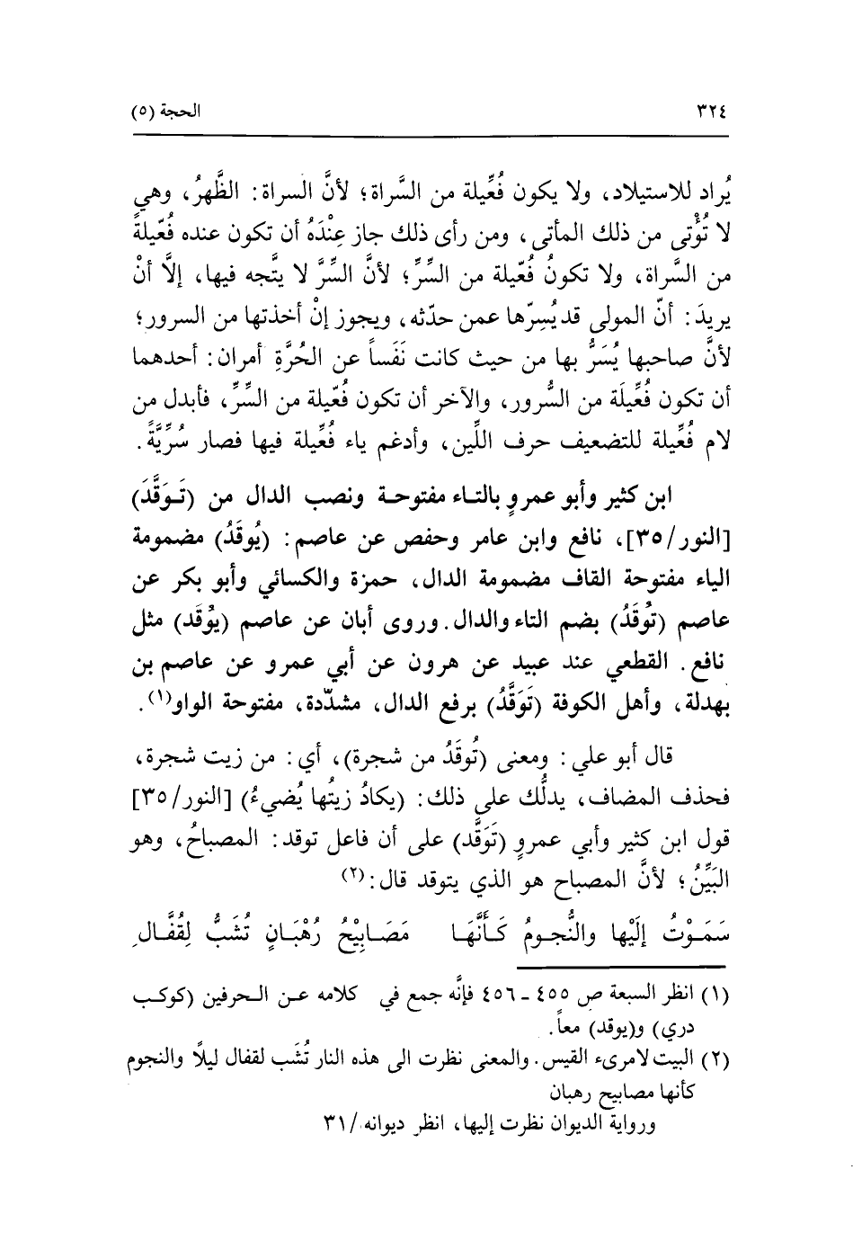 قال أبو علي: ومعنى توقد من شجرة، أي: من زيت شجرة، فحذف المضاف، يدلّك على ذلك: يكاد زيتها يضيء [النور/ 35] قول ابن كثير وأبي عمرو (توقّد) على أن فاعل توقد: المصباح، وهو البيّن، لأنّ المصباح هو الذي يتوقد قال: «2».