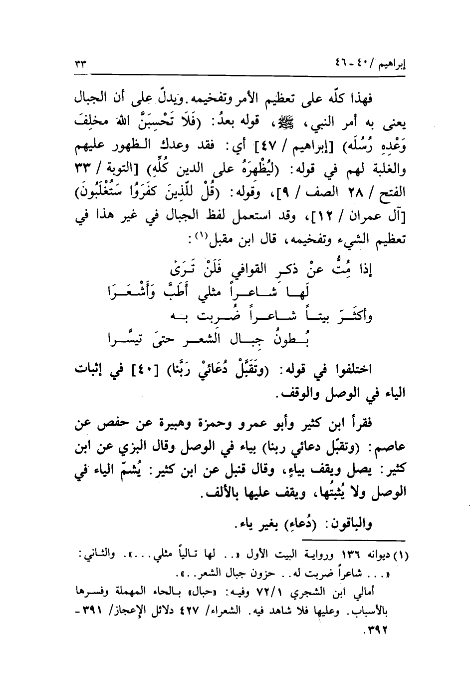 فهذا كلّه على تعظيم الأمر وتفخيمه. ويدلّ على أن الجبال يعنى به أمر النبي، صلّى الله عليه وسلم، قوله بعد: (فلا تحسبن الله مخلف وعده رسله) [إبراهيم/ 47] أي: فقد وعدك الظهور عليهم والغلبة لهم في قوله: ليظهره على الدين كله [التوبة/ 33 الفتح/ 28 الصف/ 9]، وقوله: قل للذين كفروا ستغلبون [آل عمران/ 12]، وقد استعمل لفظ الجبال في غير هذا في تعظيم الشيء وتفخيمه، قال ابن مقبل «1»: