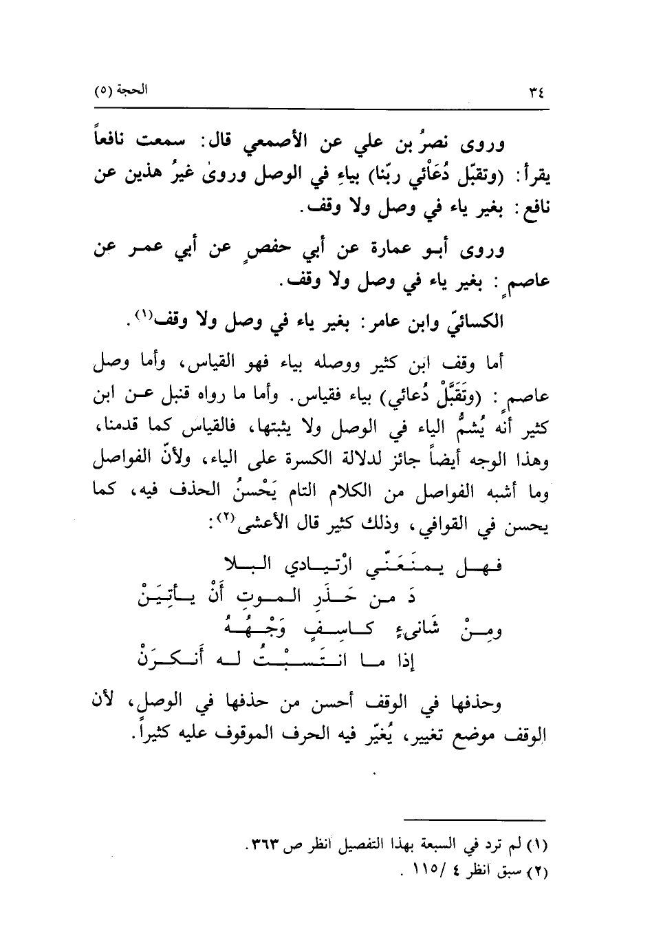 أما وقف ابن كثير ووصله بياء فهو القياس، وأما وصل عاصم: (وتقبّل دعائي) بياء فقياس. وأما ما رواه قنبل عن ابن كثير أنه يشمّ الياء في الوصل ولا يثبتها، فالقياس كما قدمنا، وهذا الوجه أيضا جائز لدلالة الكسرة على الياء، ولأنّ الفواصل وما أشبه الفواصل من الكلام التام يحسن الحذف فيه، كما يحسن في القوافي، وذلك كثير قال الأعشى «2»: