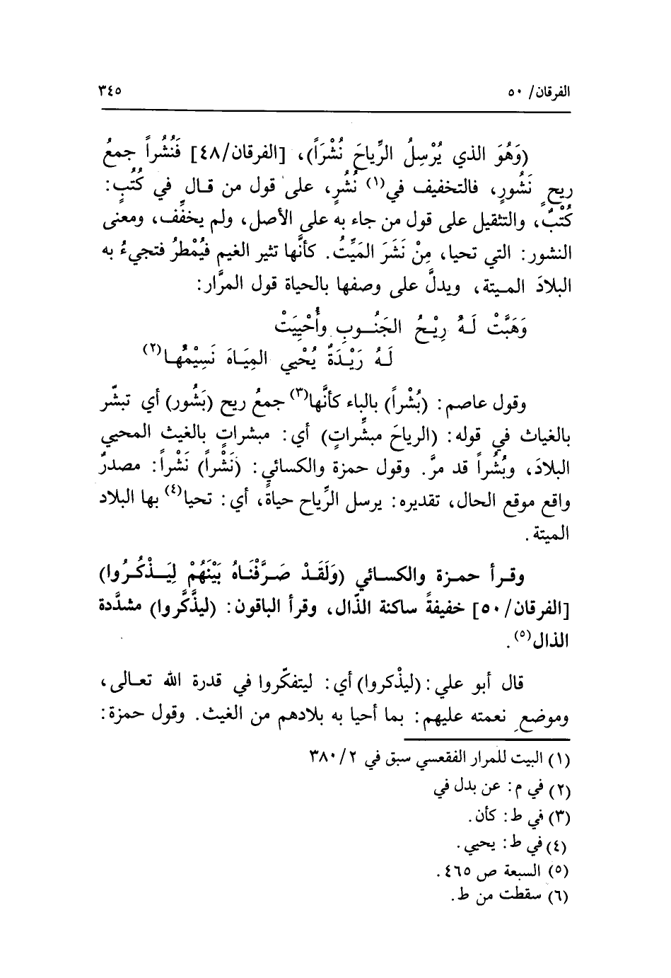 «2» وقول عاصم: بشرا بالباء كأنّها «3» جمع ريح (بشور) أي تبشّر بالغياث في قوله: الرياح مبشرات أي: مبشرات بالغيث المحيي البلاد، وبشرا قد مرّ. وقول حمزة والكسائي: (نشرا) نشرا: مصدر واقع موقع الحال، تقديره: يرسل الرّياح حياة، أي: تحيا «4» بها البلاد الميتة.