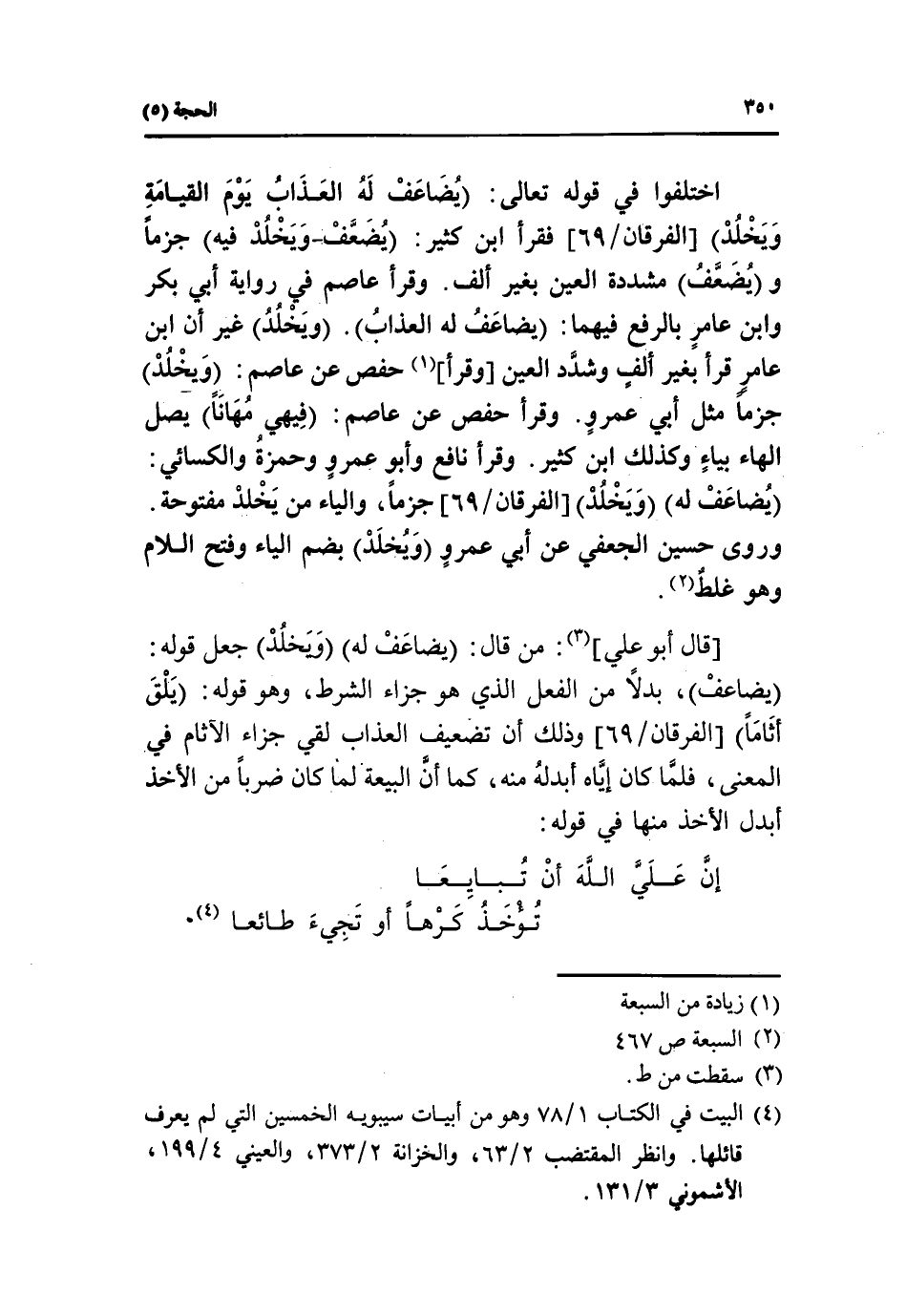 اختلفوا في قوله تعالى: يضاعف له العذاب يوم القيامة ويخلد [الفرقان/ 69] فقرأ ابن كثير: (يضعّف- ويخلد فيه) جزما و (يضعّف) مشددة العين بغير ألف. وقرأ عاصم