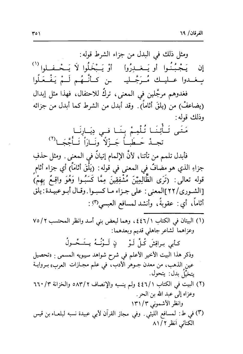 «2» فأبدل تلمم من تأتنا، لأنّ الإلمام إتيان في المعنى. ومثل حذف جزاء الذي هو مضاف في المعنى في قوله: يلق أثاما أي جزاء أثام قوله تعالى: ترى الظالمين مشفقين مما كسبوا وهو واقع بهم [الشورى/ 22] المعنى: على جزاء ما كسبوا. وقال أبو عبيدة: يلق أثاما، أي: عقوبة، وأنشد لمسافع العبسي «3»:
