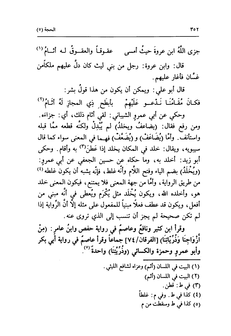ومن رفع فقال: (يضاعف ويخلد) لم يبدل ولكنّه قطعه ممّا قبله واستأنف. وأمّا يضاعف و (يضعّف) فهما في المعنى سواء كما قال سيبويه، ويقال: خلد في المكان يخلد إذا عطن «3» به أقام. وحكى أبو زيد: أخلد به، وما حكاه عن حسين الجعفي عن أبي عمرو:
