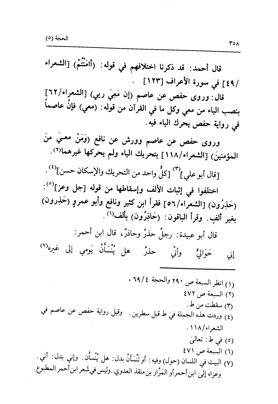 (4) وردت هذه الجملة في ط قبل سطرين. وقيل رواية حفص عن عاصم في الشعراء/ 118.