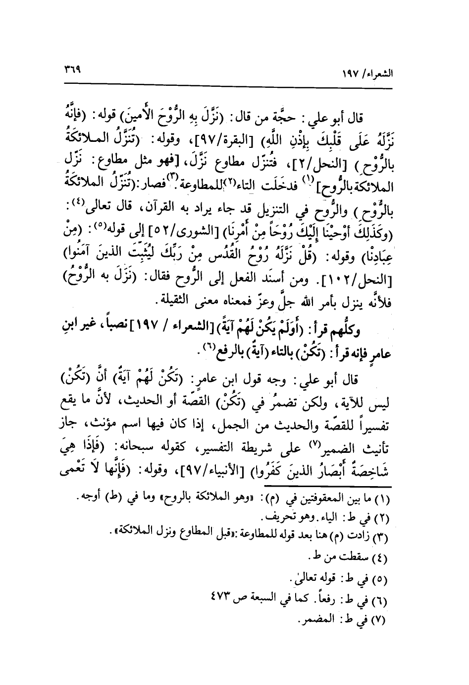 قال أبو علي: حجّة من قال: (نزّل به الرّوح الأمين) قوله: فإنه نزله على قلبك بإذن الله [البقرة/ 97]، وقوله: (تنزل الملائكة بالروح) [النحل/ 2]، فتنزّل مطاوع نزّل، [فهو مثل مطاوع: نزّل الملائكة بالرّوح] «1» فدخلت التاء «2» للمطاوعة «3». فصار: (تنزّل الملائكة بالرّوح) والرّوح في التنزيل قد جاء يراد به القرآن، قال تعالى «4»: