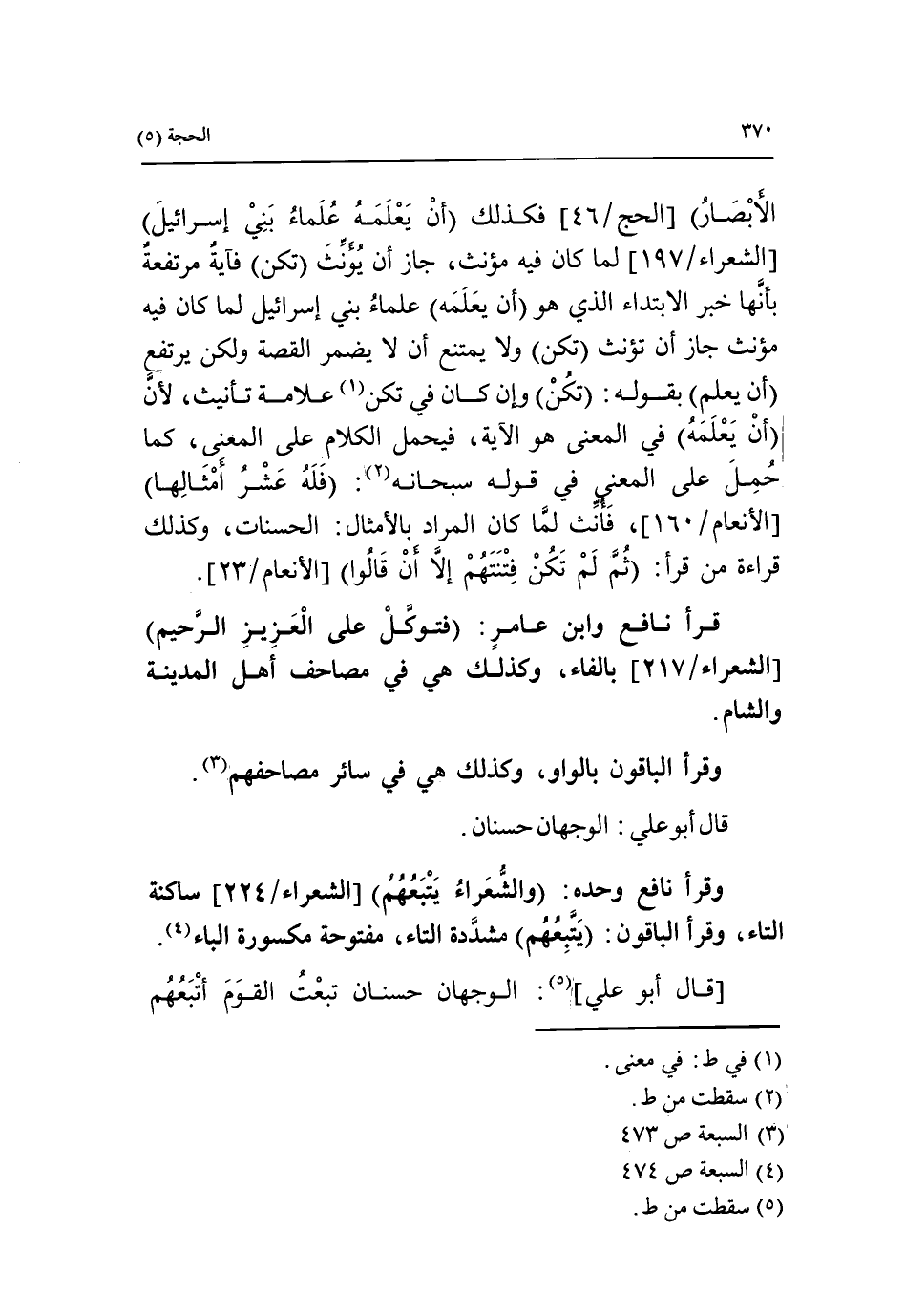 الأبصار [الحج/ 46] فكذلك أن يعلمه علماء بني إسرائيل [الشعراء/ 197] لما كان فيه مؤنث، جاز أن يؤنّث (تكن) فآية مرتفعة بأنّها خبر الابتداء الذي هو (أن يعلمه) علماء بني إسرائيل لما كان فيه مؤنث جاز أن تؤنث (تكن) ولا يمتنع أن لا يضمر القصة ولكن يرتفع (أن يعلم) بقوله: (تكن) وإن كان في تكن «1» علامة تأنيث، لأنّ أن يعلمه في المعنى هو الآية، فيحمل الكلام على المعنى، كما حمل على المعنى في قوله سبحانه «2»: فله عشر أمثالها [الأنعام/ 160]، فأنّث لمّا كان المراد بالأمثال: الحسنات، وكذلك قراءة من قرأ: ثم لم تكن فتنتهم إلا أن قالوا [الأنعام/ 23].