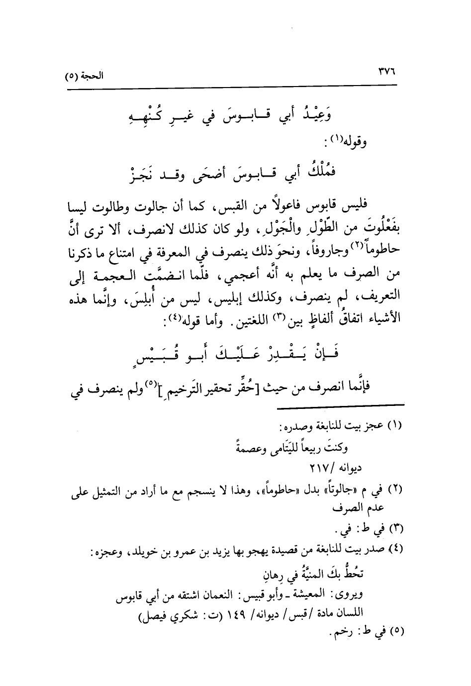 فملك أبي قابوس أضحى وقد نجز فليس قابوس فاعولا من القبس، كما أن جالوت وطالوت ليسا بفعلوت من الطّول والجول، ولو كان كذلك لانصرف، ألا ترى أنّ حاطوما «2» وجاروفا، ونحو ذلك ينصرف في المعرفة في امتناع ما ذكرنا من الصرف ما يعلم به أنّه أعجمي، فلمّا انضمّت العجمة إلى التعريف، لم ينصرف، وكذلك إبليس، ليس من أبلس، وإنّما هذه الأشياء اتفاق ألفاظ بين «3» اللغتين. وأما قوله «4»: