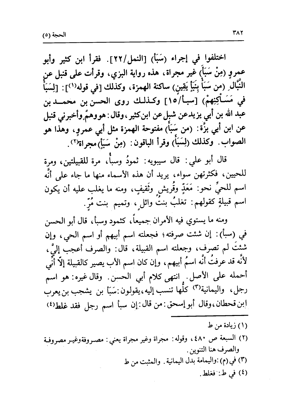 ومنه ما يستوي فيه الأمران جميعا، كثمود وسبأ، قال أبو الحسن في سبأ: إن شئت صرفته، فجعلته اسم أبيهم أو اسم الحي، وإن شئت لم تصرف، وجعلته اسم القبيلة، قال: والصرف أعجب إليّ، لأنّه قد عرفت أنّه اسم أبيهم، وإن كان اسم الأب يصير كالقبيلة إلّا أني أحمله على الأصل. انتهى كلام أبي الحسن. وقال غيره: هو اسم رجل، واليمانية «3» كلّها تنسب إليه، يقولون: سبأ بن يشجب بن يعرب ابن قحطان، وقال أبو إسحاق: من قال: إن سبأ اسم رجل فقد غلط «4»