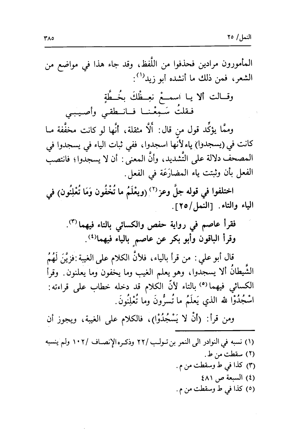 قال أبو علي: من قرأ بالياء، فلأنّ الكلام على الغيبة: فزيّن لهم الشّيطان ألا يسجدوا، وهو يعلم الغيب وما يخفون وما يعلنون. وقرأ الكسائي فيهما «5» بالتاء لأنّ الكلام قد دخله خطاب على قراءته: