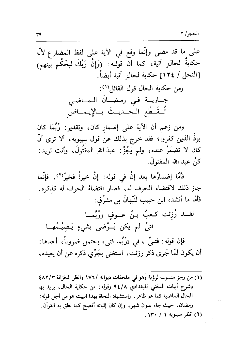 (1) من رجز منسوب لرؤبة وهو في ملحقات ديوانه/ 176 وانظر الخزانة 3/ 482 وشرح أبيات المغني للبغدادي 8/ 94 وقوله: من حكاية الحال، يريد بها الحال الماضية كما هو ظاهر. واستشهاد النحاة بهذا البيت هو من أجل قوله: