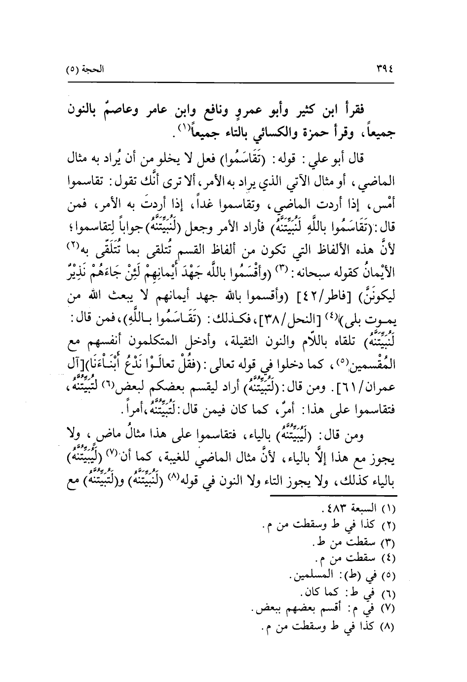 قال أبو علي: قوله: تقاسموا فعل لا يخلو من أن يراد به مثال الماضي، أو مثال الآتي الذي يراد به الأمر، ألا ترى أنّك تقول: تقاسموا أمس، إذا أردت الماضي، وتقاسموا غدا، إذا أردت به الأمر، فمن قال: تقاسموا بالله لنبيتنه فأراد الأمر وجعل لنبيتنه جوابا لتقاسموا، لأنّ هذه الألفاظ التي تكون من ألفاظ القسم تتلقى بما تتلقّى به «2» الأيمان كقوله سبحانه: «3» وأقسموا بالله جهد أيمانهم لئن جاءهم نذير ليكونن [فاطر/ 42] وأقسموا بالله جهد أيمانهم لا يبعث الله من يموت بلى «4» [النحل/ 38]، فكذلك: تقاسموا بالله، فمن قال:
