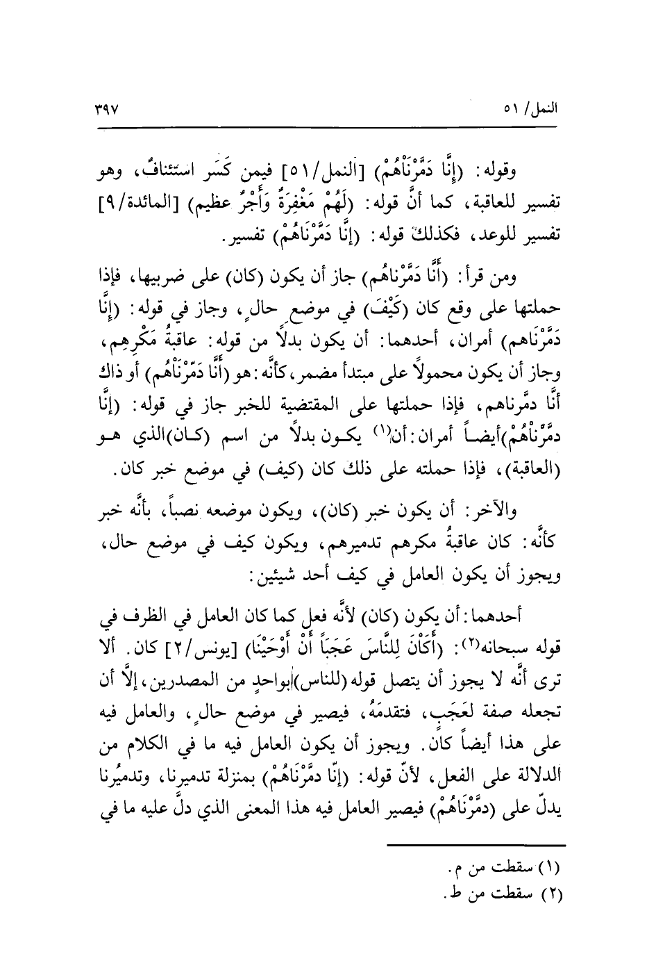 وقوله: (إنا دمرناهم) [النمل/ 51] فيمن كسر استئناف، وهو تفسير للعاقبة، كما أنّ قوله: لهم مغفرة وأجر عظيم [المائدة/ 9] تفسير للوعد، فكذلك قوله: (إنّا دمّرناهم) تفسير.