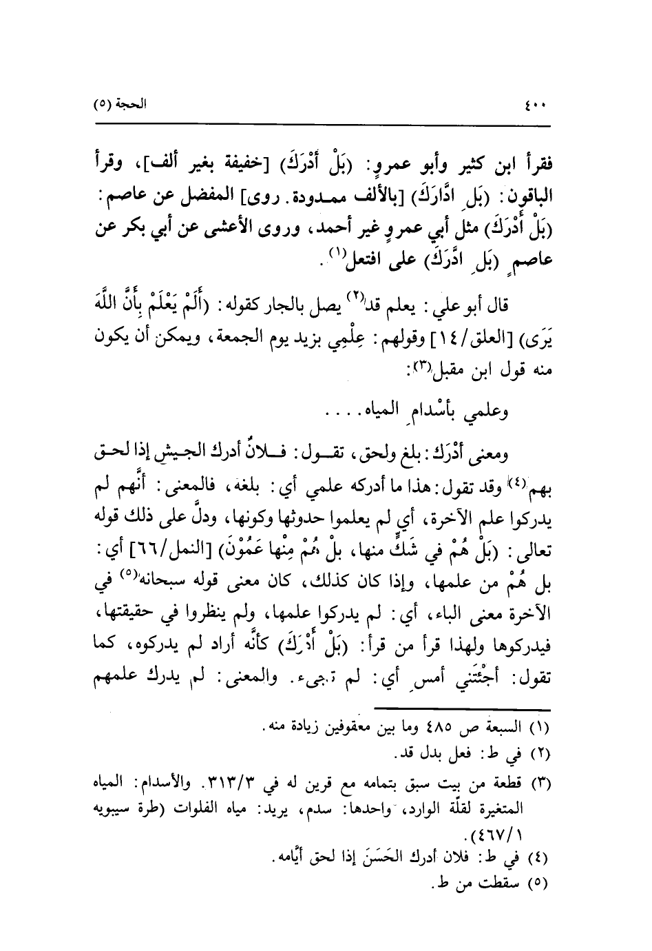 ومعنى أدرك: بلغ ولحق، تقول: فلان أدرك الجيش إذا لحق بهم «4» وقد تقول: هذا ما أدركه علمي أي: بلغه، فالمعنى: أنّهم لم يدركوا علم الآخرة، أي لم يعلموا حدوثها وكونها، ودلّ على ذلك قوله تعالى: بل هم في شك منها، بل هم منها عمون [النمل/ 66] أي: