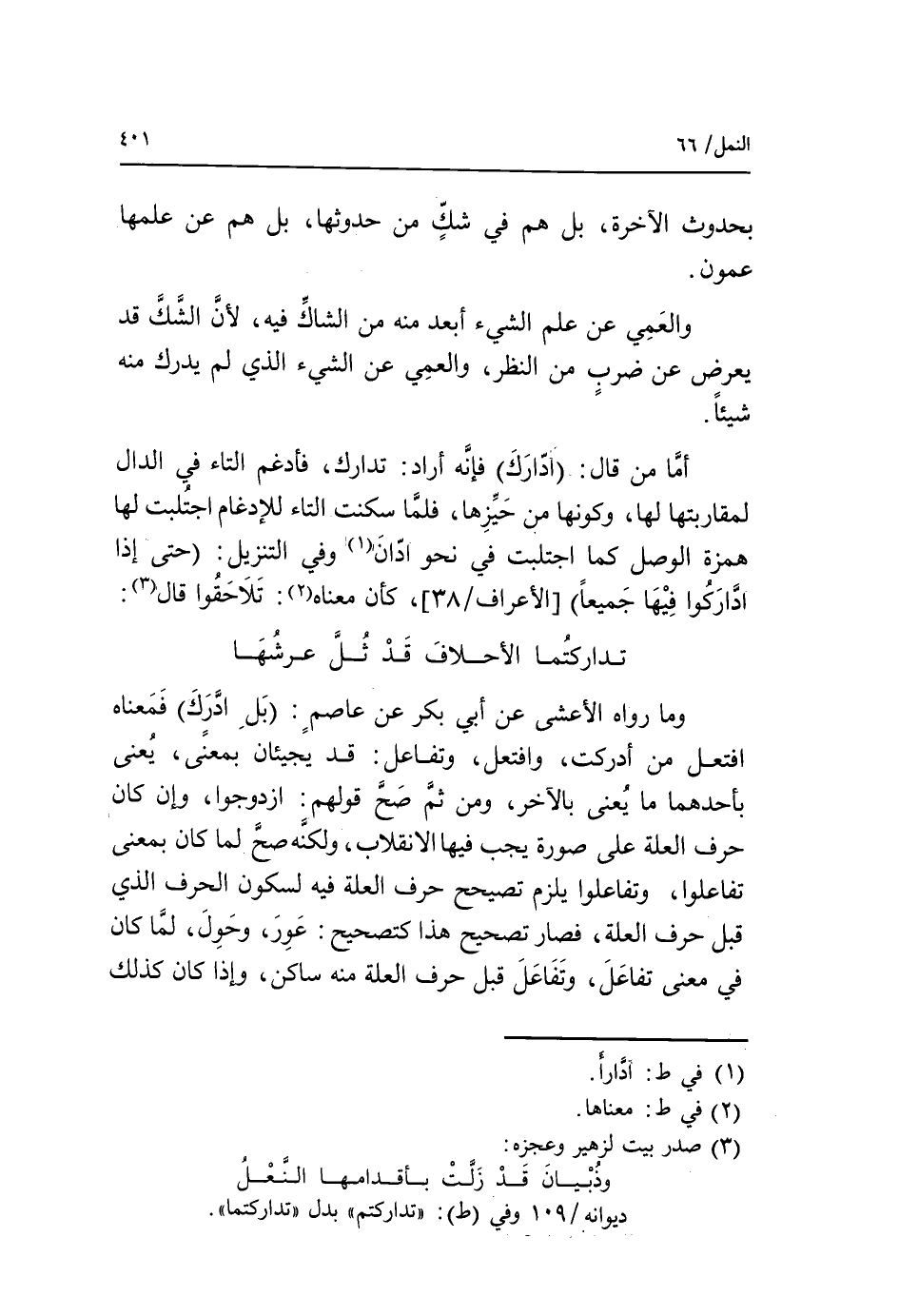 تداركتما الأحلاف قد ثلّ عرشها وما رواه الأعشى عن أبي بكر عن عاصم: بل ادرك فمعناه افتعل من أدركت، وافتعل، وتفاعل: قد يجيئان بمعنى، يعنى بأحدهما ما يعنى بالآخر، ومن ثمّ صحّ قولهم: ازدوجوا، وإن كان حرف العلة على صورة يجب فيها الانقلاب، ولكنّه صحّ لما كان بمعنى تفاعلوا، وتفاعلوا يلزم تصحيح حرف العلة فيه لسكون الحرف الذي قبل حرف العلة، فصار تصحيح هذا كتصحيح: عور، وحول، لمّا كان في معنى تفاعل، وتفاعل قبل حرف العلة منه ساكن، وإذا كان كذلك
