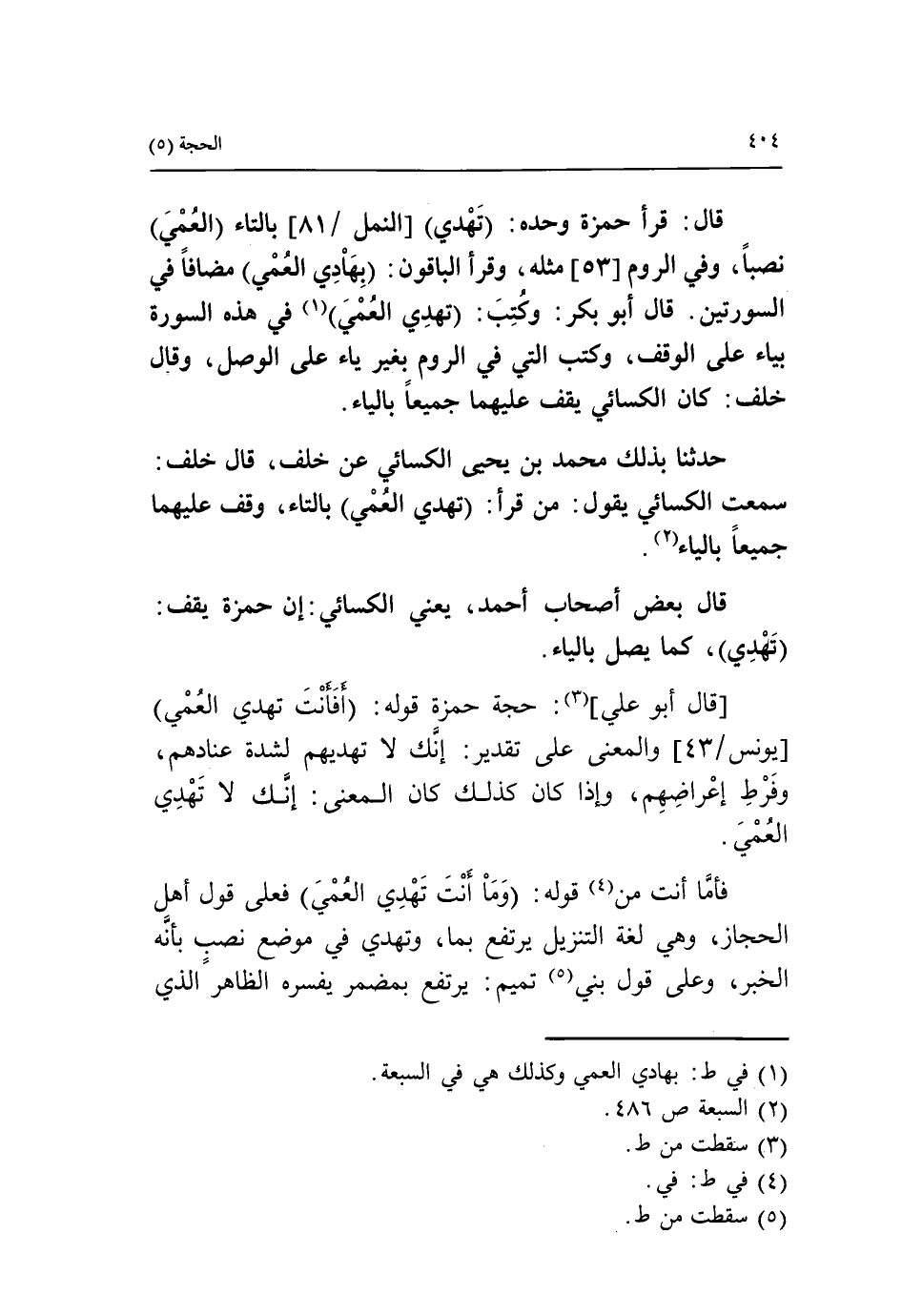 [قال أبو علي] «3»: حجة حمزة قوله: أفأنت تهدي العمي [يونس/ 43] والمعنى على تقدير: إنّك لا تهديهم لشدة عنادهم، وفرط إعراضهم، وإذا كان كذلك كان المعنى: إنّك لا تهدي العمي.