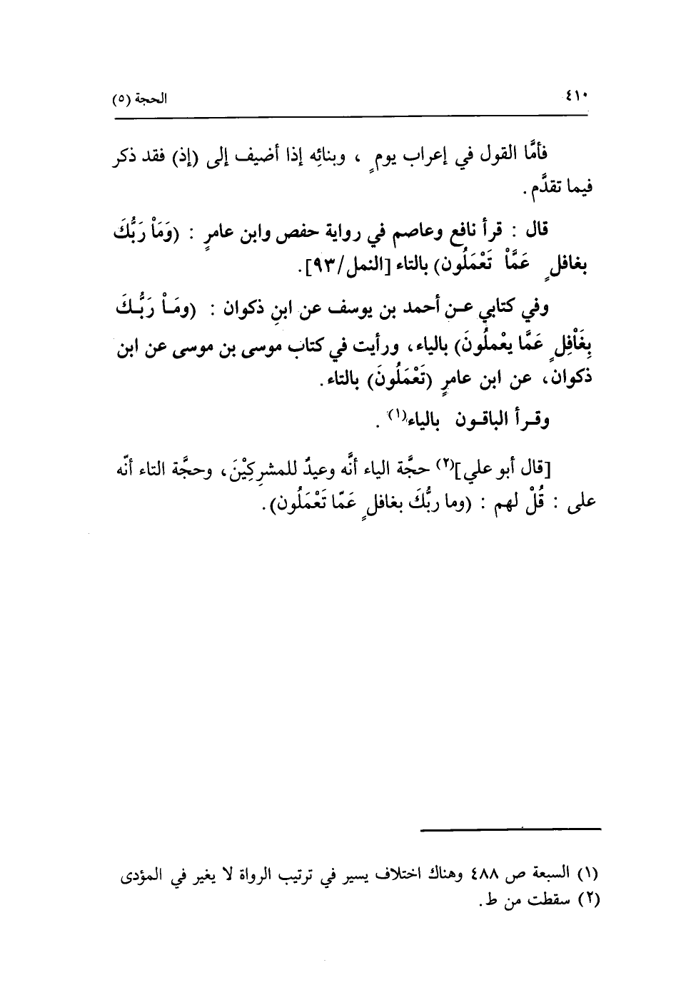 قال: قرأ نافع وعاصم في رواية حفص وابن عامر: وما ربك بغافل عما تعملون بالتاء [النمل/ 93].