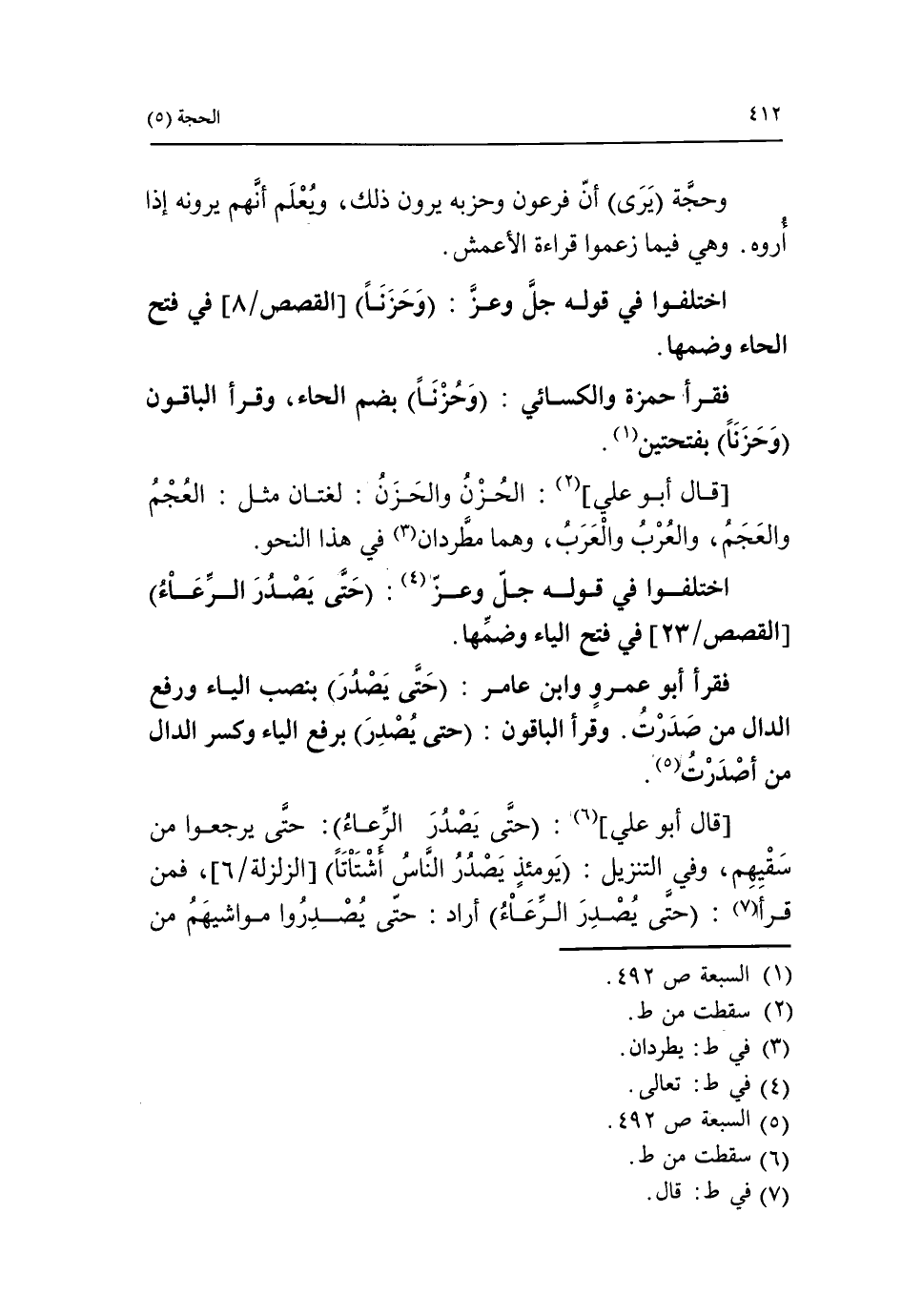 فقرأ أبو عمرو وابن عامر: (حتّى يصدر) بنصب الياء ورفع الدال من صدرت. وقرأ الباقون: حتى يصدر برفع الياء وكسر الدال من أصدرت «5».