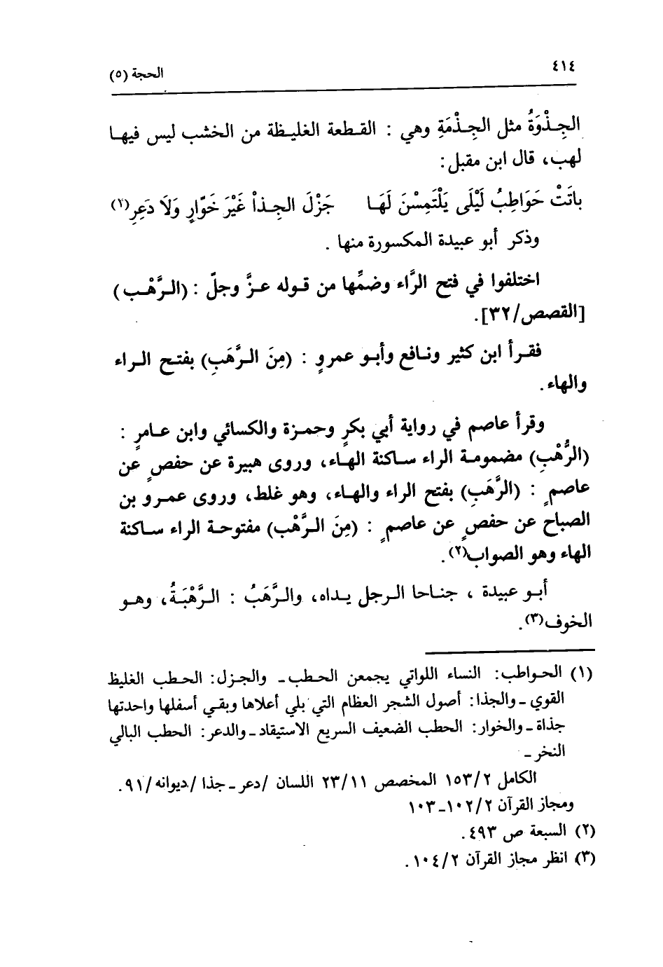 (الرّهب) مضمومة الراء ساكنة الهاء، وروى هبيرة عن حفص عن عاصم: (الرّهب) بفتح الراء والهاء، وهو غلط، وروى عمرو بن الصباح عن حفص عن عاصم: من الرهب مفتوحة الراء ساكنة الهاء وهو الصواب «2».
