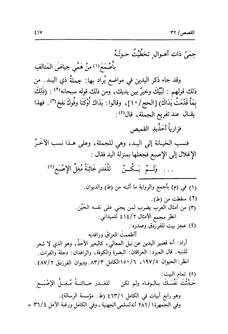 «1» من همّي حياض المتالف وقد جاء ذكر اليدين في مواضع يراد بها: جملة ذي اليد. من ذلك قولهم: لبّيك وخير بين يديك، ومن ذلك قوله سبحانه «2»: ذلك بما قدمت يداك [الحج/ 10]، وقالوا: يداك أوكتا وفوك نفخ «3». فهذا يقال عند تفريع الجملة، قال «4»: