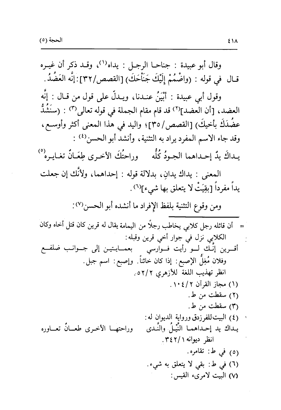 وقول أبي عبيدة: أبين عندنا، ويدلّ على قول من قال: إنّه العضد، [أن العضد] «2» قد قام مقام الجملة في قوله تعالى «3»: سنشد عضدك بأخيك [القصص/ 35]، واليد في هذا المعنى أكثر وأوسع، وقد جاء الاسم المفرد يراد به التثنية، وأنشد أبو الحسن «4»: