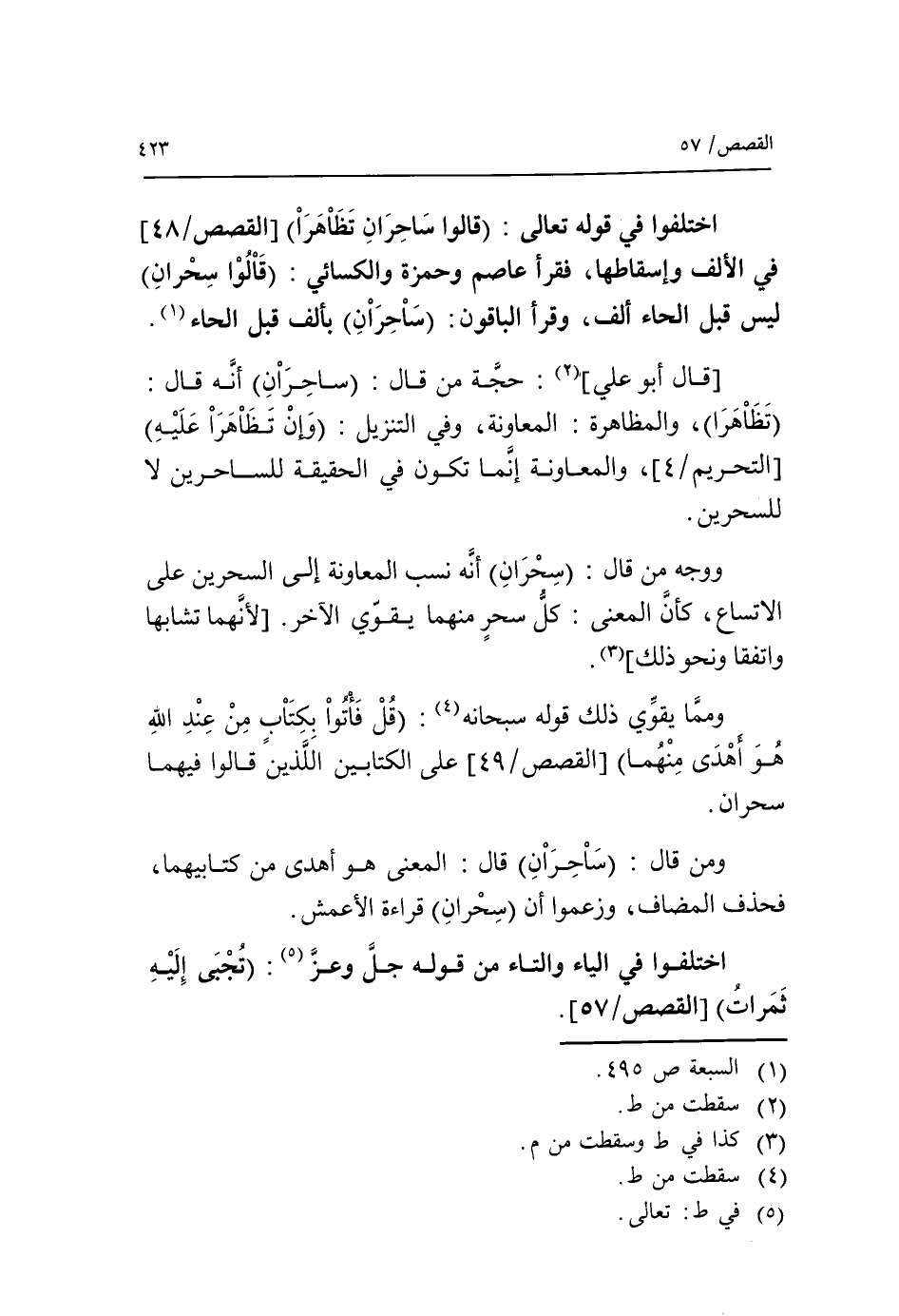 اختلفوا في قوله تعالى: (قالوا ساحران تظاهرا) [القصص/ 48] في الألف وإسقاطها، فقرأ عاصم وحمزة والكسائي: قالوا سحران ليس قبل الحاء ألف، وقرأ الباقون: (ساحران) بألف قبل الحاء «1».