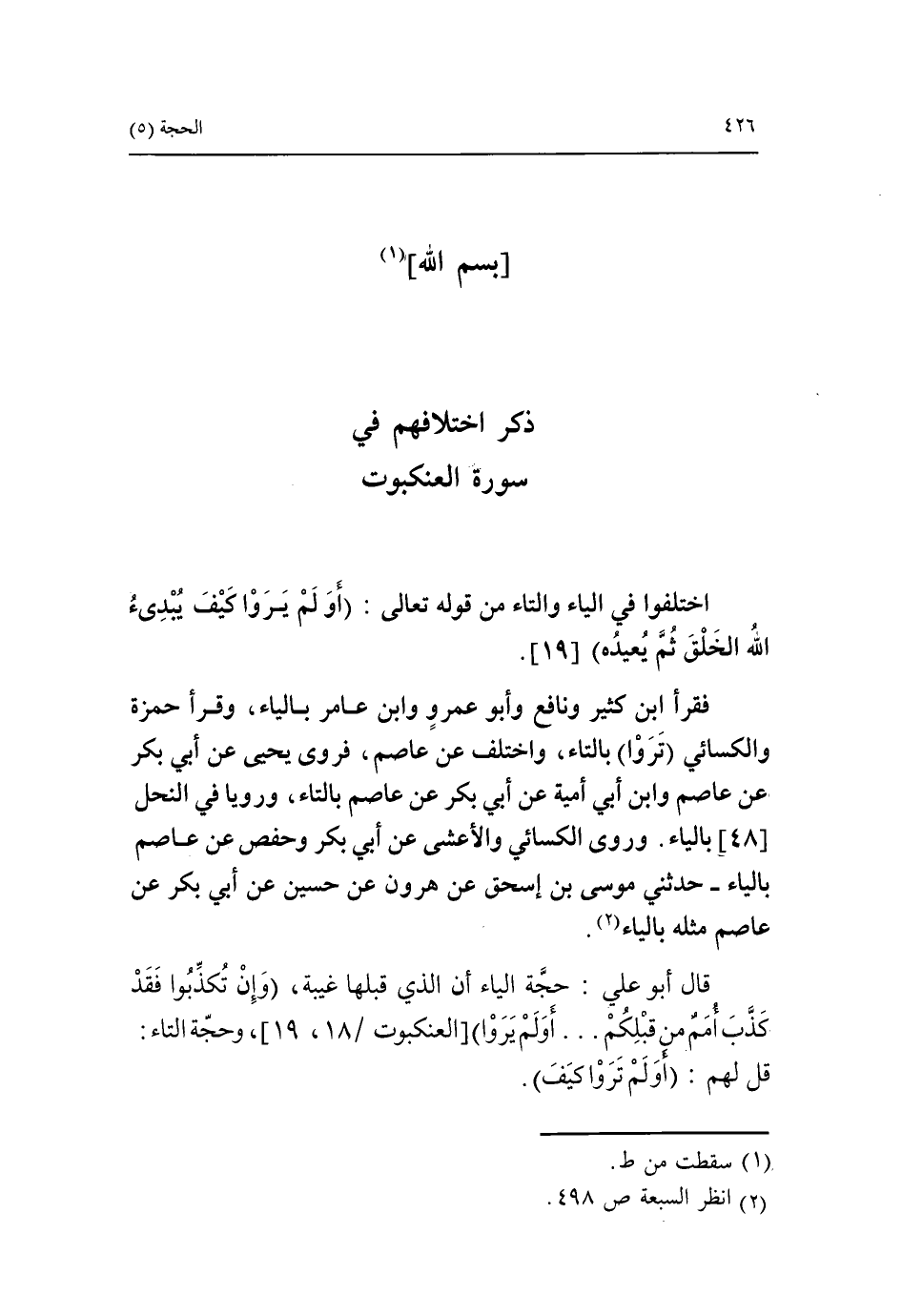اختلفوا في الياء والتاء من قوله تعالى: أولم يروا كيف يبدىء الله الخلق ثم يعيده [19].
