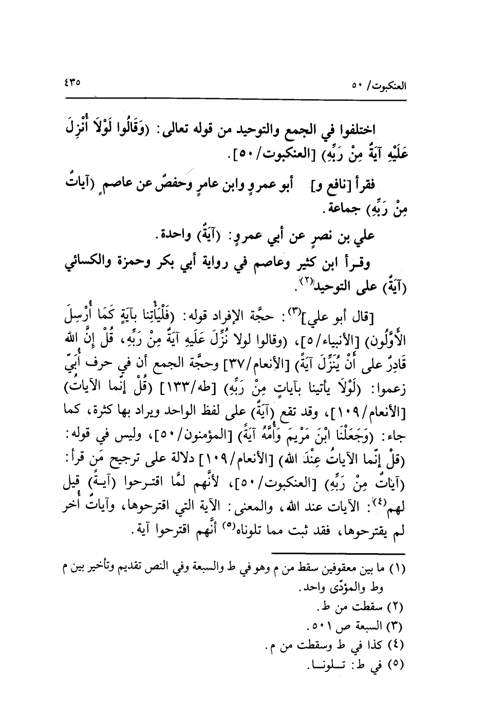 اختلفوا في الجمع والتوحيد من قوله تعالى: (وقالوا لولا أنزل عليه آية من ربه) [العنكبوت/ 50].