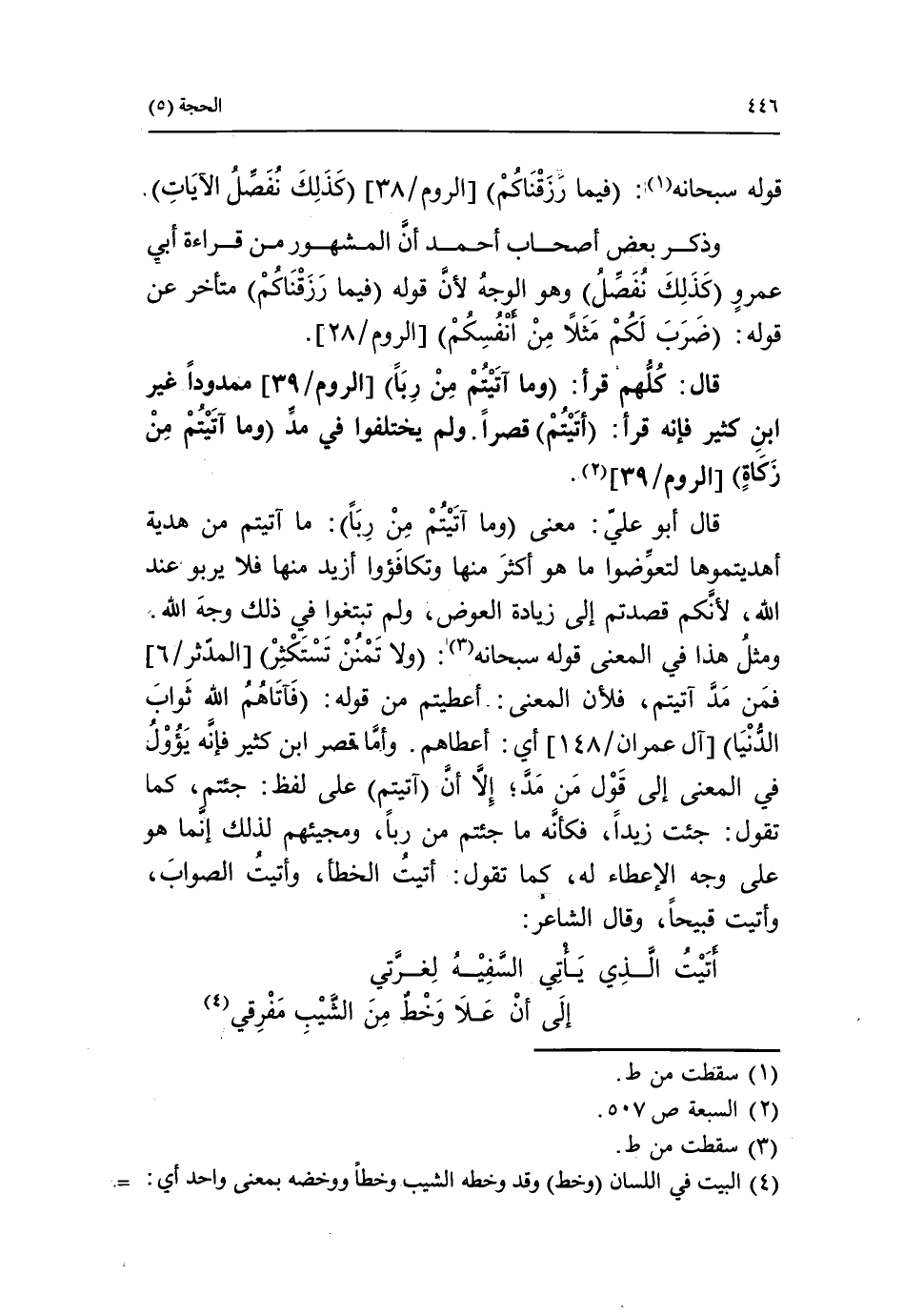 ومثل هذا في المعنى قوله سبحانه «3»: ولا تمنن تستكثر [المدّثر/ 6] فمن مدّ آتيتم، فلأن المعنى: أعطيتم من قوله: فآتاهم الله ثواب الدنيا [آل عمران/ 148] أي: أعطاهم. وأمّا قصر ابن كثير فإنّه يؤول في المعنى إلى قول من مدّ، إلّا أنّ (آتيتم) على لفظ: جئتم، كما تقول: جئت زيدا، فكأنّه ما جئتم من ربا، ومجيئهم لذلك إنّما هو على وجه الإعطاء له، كما تقول: أتيت الخطأ، وأتيت الصواب، وأتيت قبيحا، وقال الشاعر: