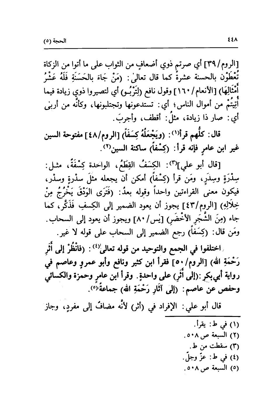 [الروم/ 39] أي صرتم ذوي أضعاف من الثواب على ما أتوا من الزكاة تعطون بالحسنة عشرة كما قال تعالى: من جاء بالحسنة فله عشر أمثالها [الأنعام/ 160] وقول نافع (لتربو) أي لتصيروا ذوي زيادة فيما أتيتم من أموال الناس، أي: تستدعونها وتجتلبونها، وكأنّه من أربى أي: صار ذا زيادة، مثل: أقطف، وأجرب.